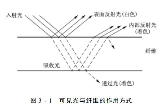 纖維可看成是半透明物體, 部分光可進(jìn)入纖維內(nèi)部, 在內(nèi)部主要發(fā)生吸收、散射或發(fā)射熒光。吸收主要由染料和光發(fā)生互相作用, 即發(fā)生選擇吸收, 互補(bǔ)光被漫反射或透過(guò)纖維, 使纖維呈現(xiàn)顏色, 未被吸收的光則在纖維內(nèi)部發(fā)生散射, 部分光也透射出來(lái)。