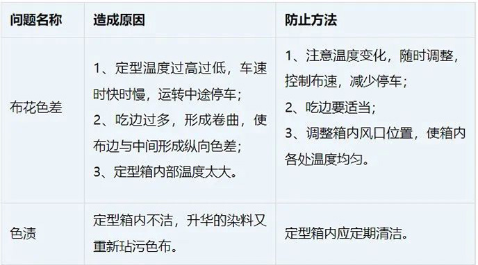 如果熱定形溫度過低,時(shí)間過短均能造成織物表面不平整、不挺括、門幅收縮等疵病,失去定形作用;如定形溫度過高或時(shí)間過長,會(huì)造成織物發(fā)硬變脆,強(qiáng)力下降,彈性降低并能使某些分散染料升華而產(chǎn)生色差,嚴(yán)重的甚至能使纖維熔融。