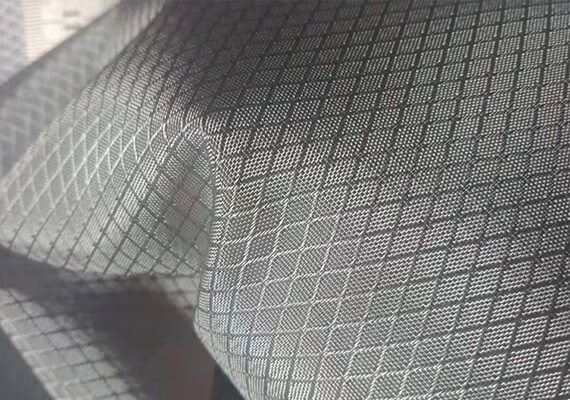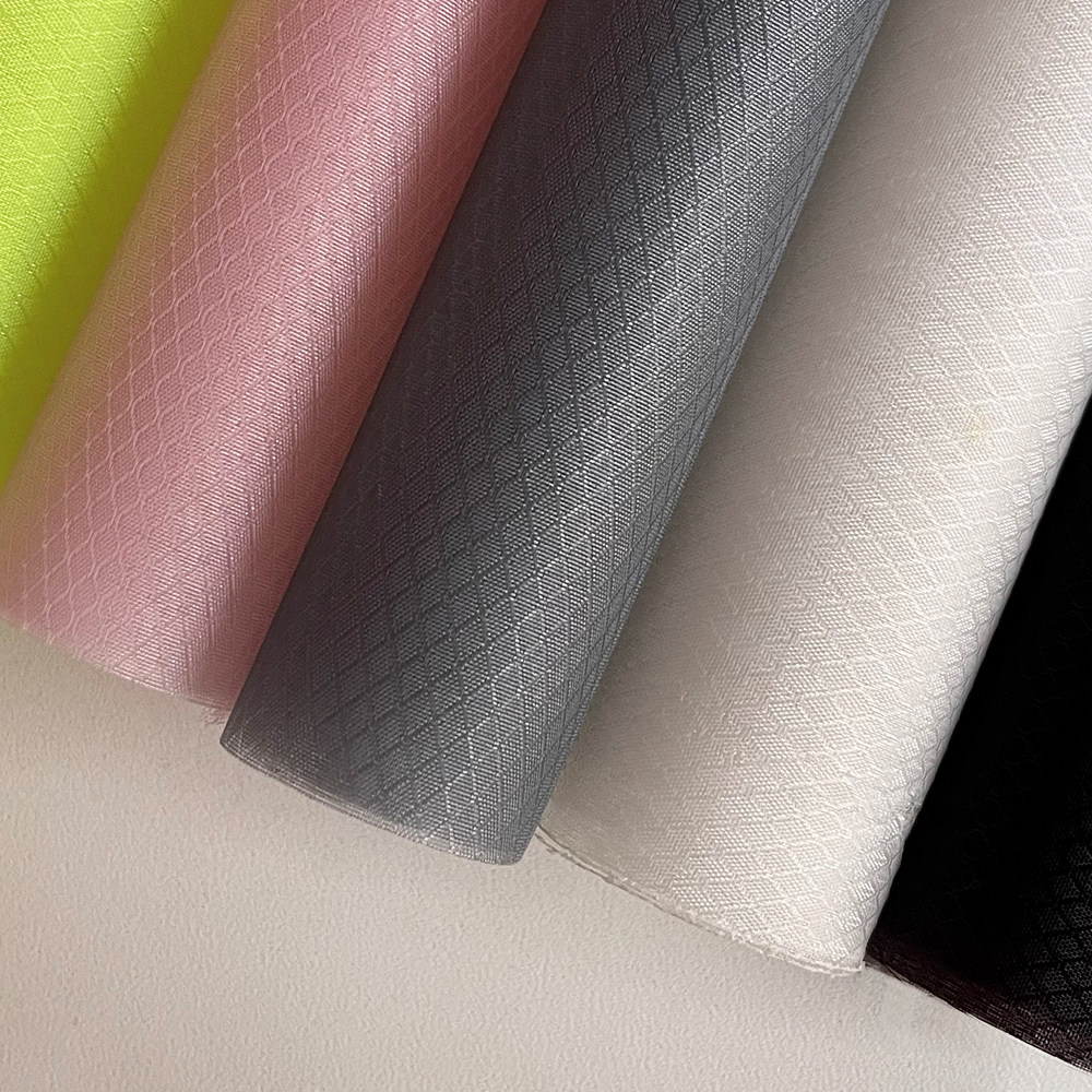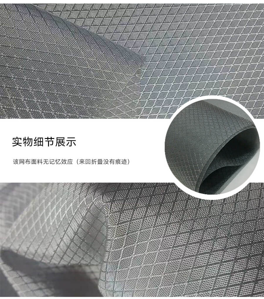 這種織物采用兩種編織技術,提花和條帶編織。它是指使用單根復絲進行織造和提花織造。這種尼龍面料的形狀是由復絲編織的方格和單絲提花技術編織的小四角組成的復合面料。