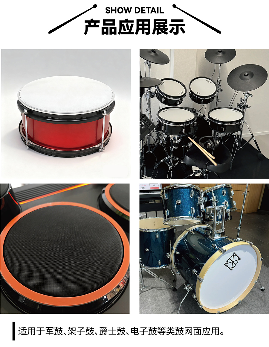 鼓皮絲網(wǎng)是覆蓋于鼓皮表面或鼓腔外側的防護與聲學輔助配件,主要采用尼龍、聚酯或特殊化纖材質經(jīng)精密編織制成,核心定位是 “保護鼓皮 + 優(yōu)化聲學表現(xiàn)”,尤其以硬挺質感為核心優(yōu)勢,適配架子鼓、非洲鼓、手鼓等多種鼓類樂器。